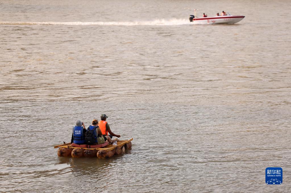 游客在黃河甘肅蘭州段體驗羊皮筏子(9月5日攝)。