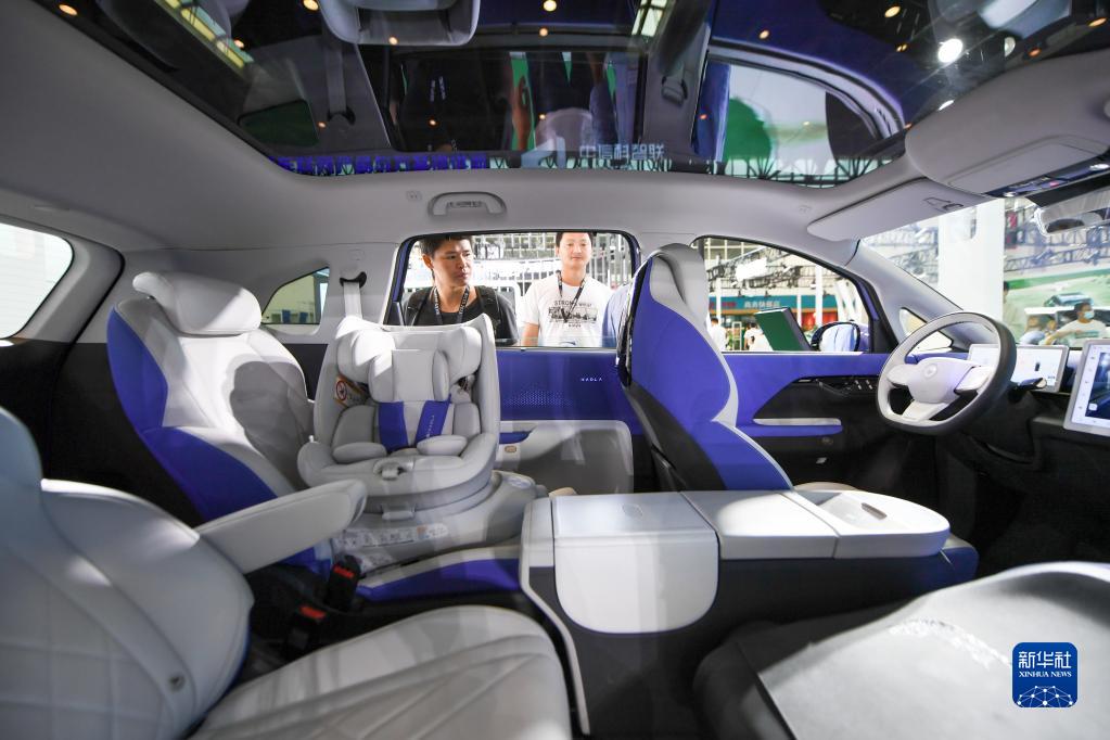 9月21日,在2023世界智能網(wǎng)聯(lián)汽車大會室內(nèi)展區(qū),幾位參觀者在參觀一輛新能源汽車。