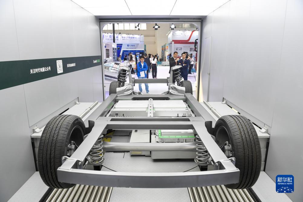 9月21日,在2023世界智能網(wǎng)聯(lián)汽車大會(huì)室內(nèi)展區(qū),參觀者在參觀一家企業(yè)的新能源汽車換電演示。