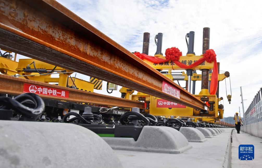 9月21日,中鐵一局建設者采用我國自主研發的新型智能本鄰兩線鋪軌機組進行鋪軌作業,該機組可實現跨線鋪軌,使高鐵線路軌道鋪設更加高效。