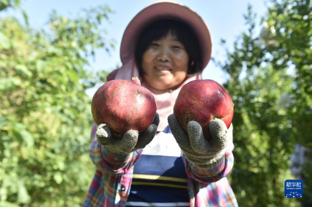 9月21日,村民在“拾榴花果山”農業生態園里展示剛采摘的石榴。