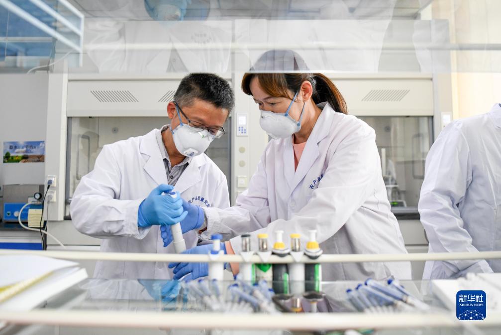 來自福建省武夷山市經濟作物技術站的援疆干部黃文慶(左)和當地農技人員一起做檢測(9月21日攝)。