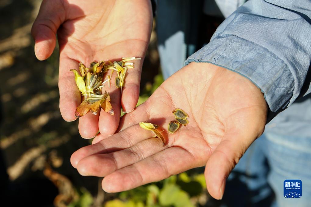 來(lái)自福建省武夷山市經(jīng)濟(jì)作物技術(shù)站的援疆干部黃文慶在觀察試種的大葉蛋白菊種子(9月20日攝)。