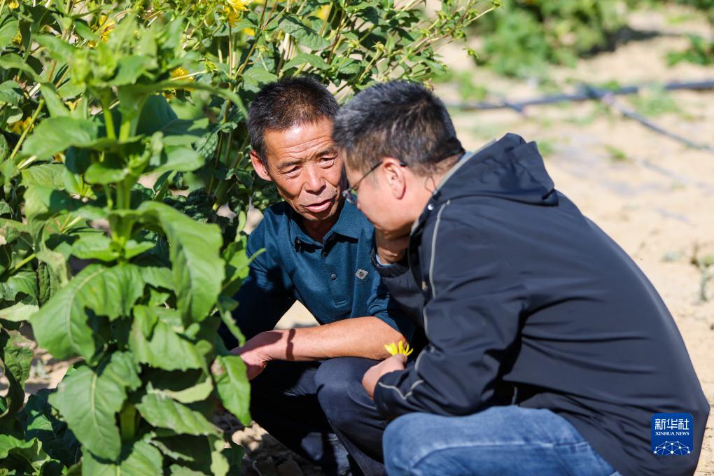 來自福建省南平市光澤縣農業農村局的援疆干部呂軍(右)與新疆木壘生福生態農業發展有限公司負責人閆生福交流試種的大葉蛋白菊生長情況(9月20日攝)。