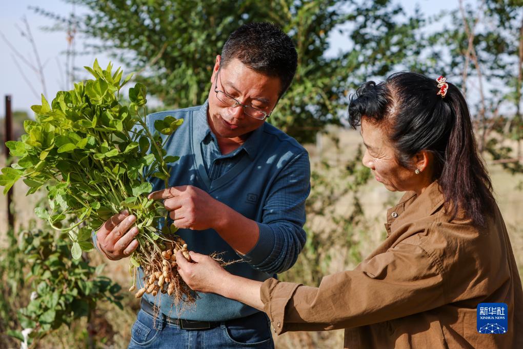 來自福建省南平市光澤縣農(nóng)業(yè)農(nóng)村局的援疆干部呂軍(左)與木壘縣三畦村農(nóng)戶盛艷玲交流試種的花生生長情況(9月20日攝)。