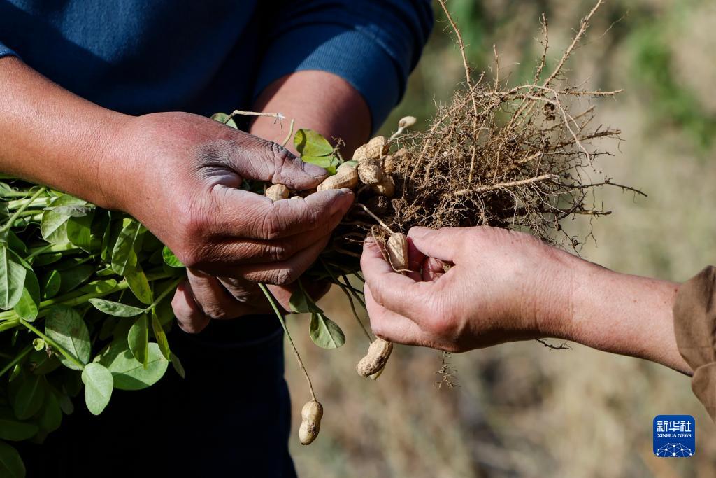 來自福建省南平市光澤縣農業農村局的援疆干部呂軍(左)與木壘縣三畦村交流試種的花生生長情況(9月20日攝)。