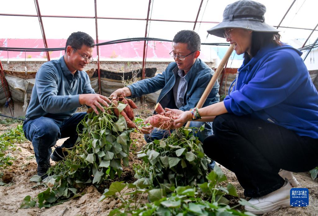 在福建漳州援建的木壘縣農(nóng)業(yè)產(chǎn)業(yè)示范園里,來自福建省南平市光澤縣農(nóng)業(yè)農(nóng)村局的援疆干部呂軍(左)、來自福建省武夷山市經(jīng)濟作物技術(shù)站的援疆干部黃文慶(中)和來自福建省漳州市農(nóng)業(yè)農(nóng)村局的黃素英在一起探討試種的新品種番薯生長情況(9月20日攝)。