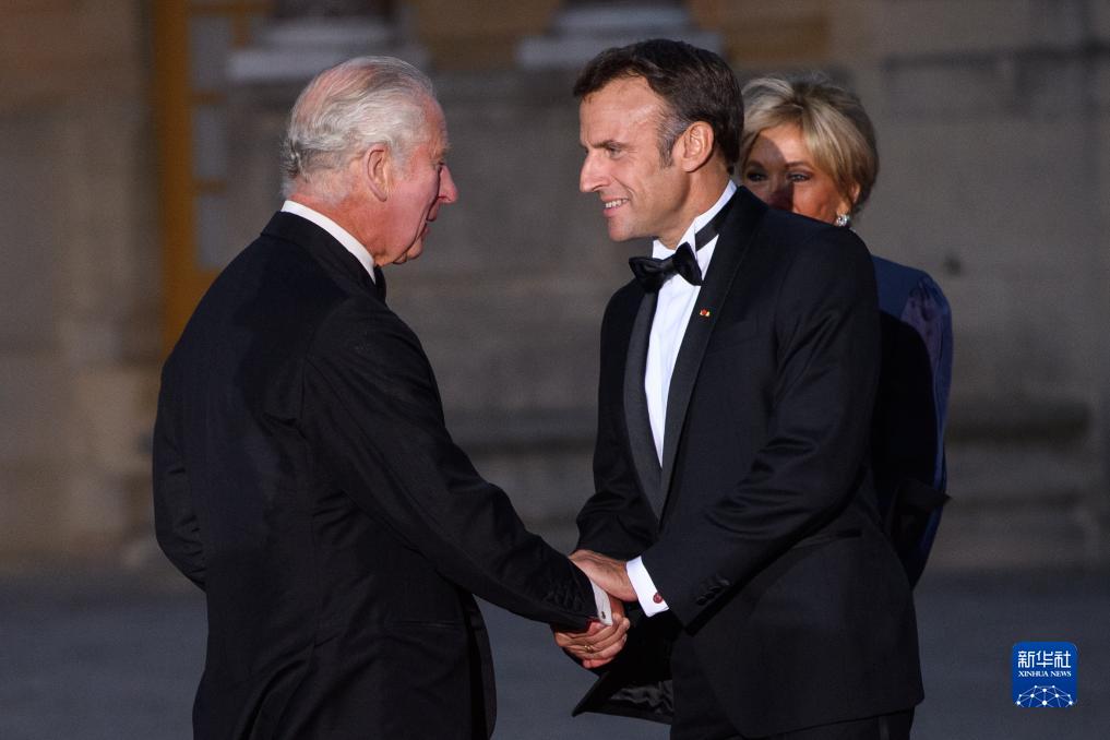 9月20日,在法國巴黎近郊的凡爾賽宮,法國總統(tǒng)馬克龍(中)迎接前來出席國宴的英國國王查爾斯三世(左一)。
