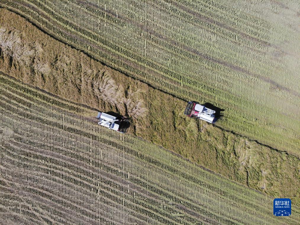 這是9月21日在位于雙鴨山市友誼縣的北大荒農(nóng)業(yè)股份有限公司友誼分公司一地塊拍攝的水稻收獲現(xiàn)場(chǎng)(無(wú)人機(jī)照片)。