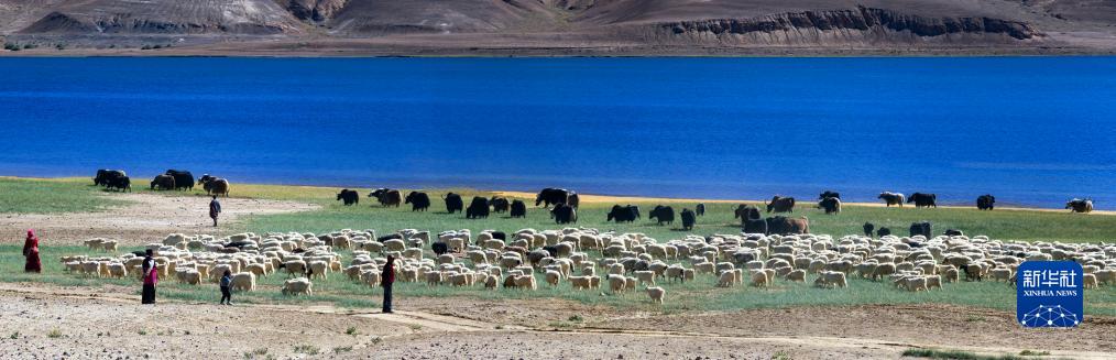 牧民在班公湖畔放牧(無人機照片,9月21日攝)。