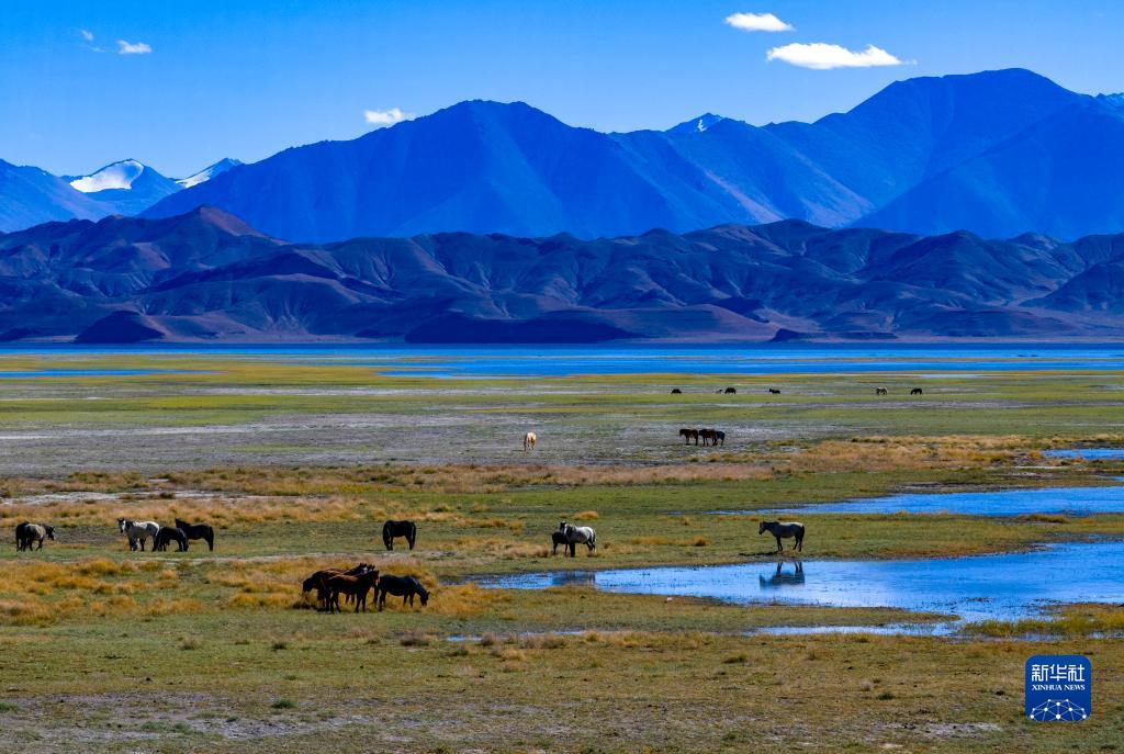 鳥瞰班公湖畔的濕地(無人機照片,9月21日攝)。