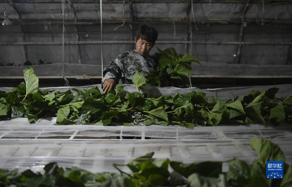 9月21日,在汝州市焦村鎮一處養蠶大棚內,村民在用桑葉喂食桑蠶。