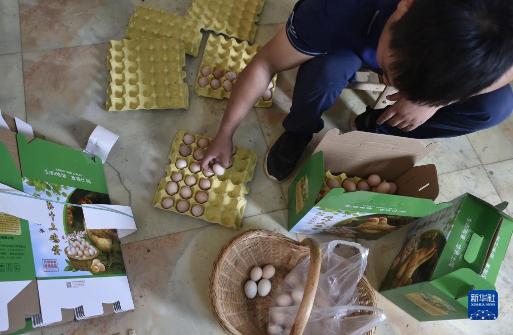 9月21日,在汝州市焦村鎮一家種養殖合作社,工作人員在包裝桑葉土雞蛋。