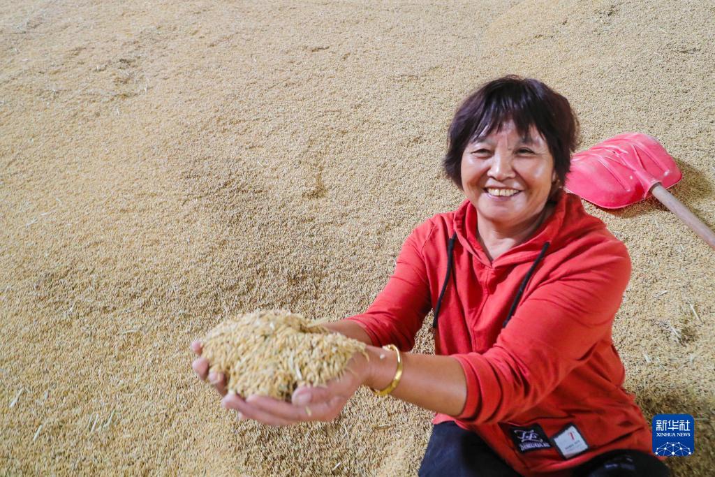 9月21日,在河南省信陽市光山縣羅陳鄉張樓村,合作社社員在一處機械化水稻烘干中心展示稻谷。