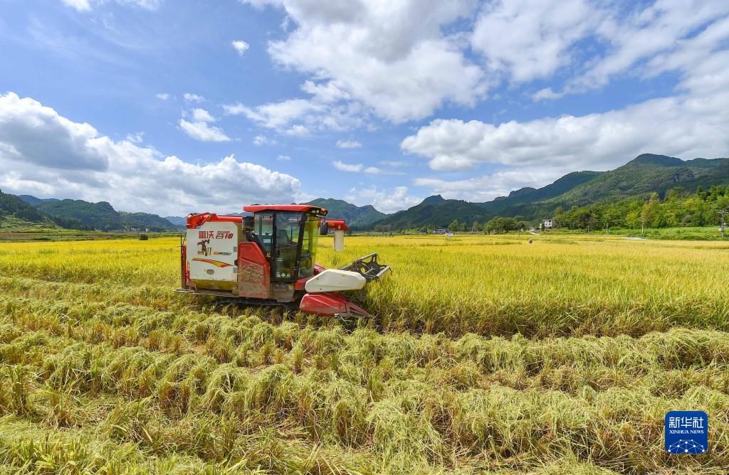 9月18日,農民駕駛收割機在貴州省銅仁市松桃苗族自治縣普覺鎮水稻種植基地收割稻谷。