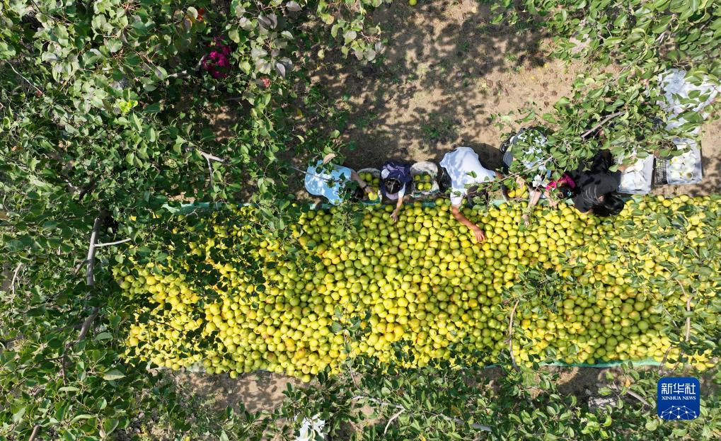 農(nóng)民和游客在趙縣樂植堂梨果種植專業(yè)合作社的梨園內(nèi)整理雪花梨(9月22日攝,無人機(jī)照片)。