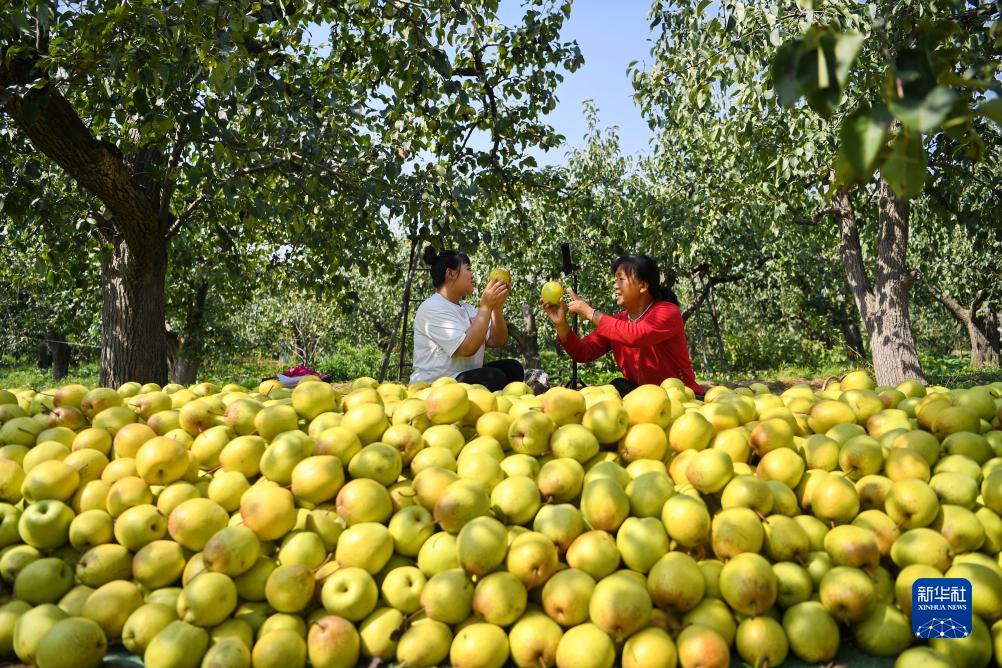 9月22日,趙縣樂植堂梨果種植專業合作社的農民在通過網絡直播推介自家梨果。新華社記者 牟宇 攝
