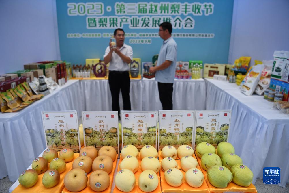 9月22日,客商在趙縣舉辦的梨果產業發展推介會上介紹梨果深加工產品。新華社記者 牟宇 攝