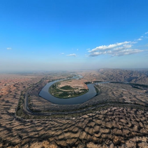 黃河在流經甘肅后,奔騰一路蜿蜒向東,在即將進入“幾”字彎時劃出一個完美的半圓,圓弧外是騰格里沙漠的無垠瀚海,圓弧內河水滔滔,滿目蒼翠。大自然的厚愛,讓水和沙在寧夏中衛市沙坡頭邂逅,形成沙水交融的獨特景觀。