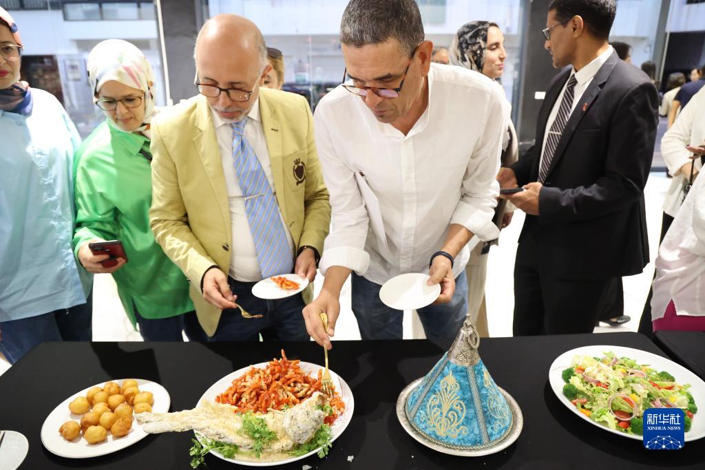 9月21日,在摩洛哥首都拉巴特,摩洛哥嘉賓在“你好,北京”文旅交流活動中品嘗菊花魚。