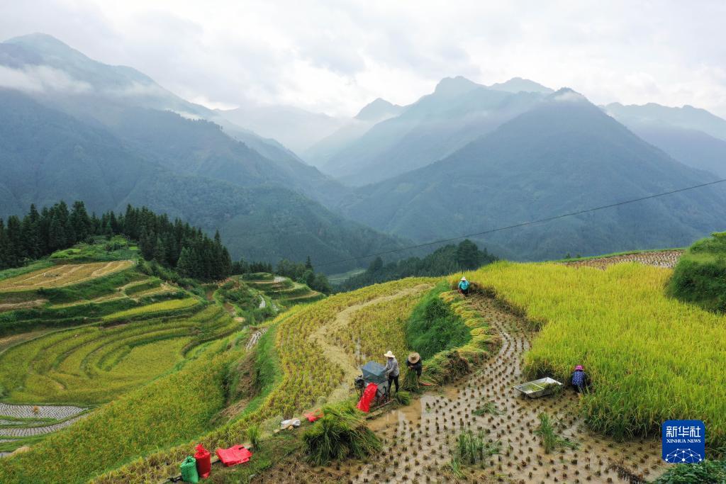 9月23日,村民在貴州省黔東南苗族侗族自治州從江縣剛邊壯族鄉(xiāng)宰別村收割水稻(無(wú)人機(jī)照片)。