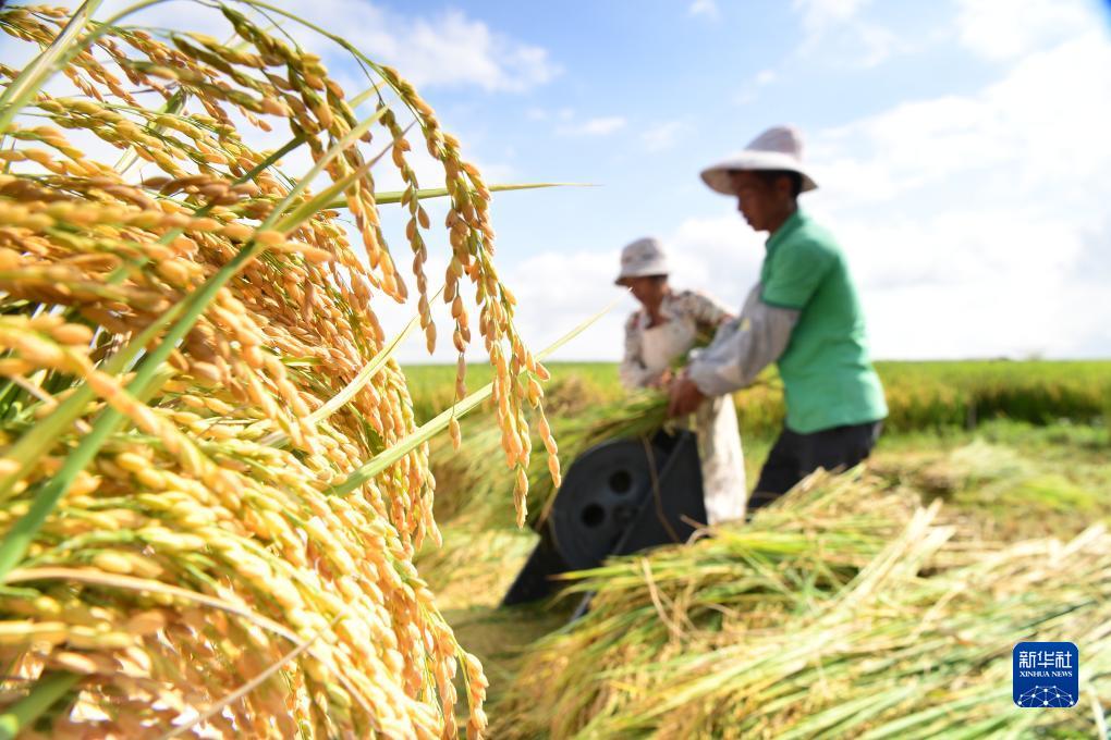9月23日,云南省曲靖市羅平縣羅雄街道羊者窩村的農民在搶收水稻。