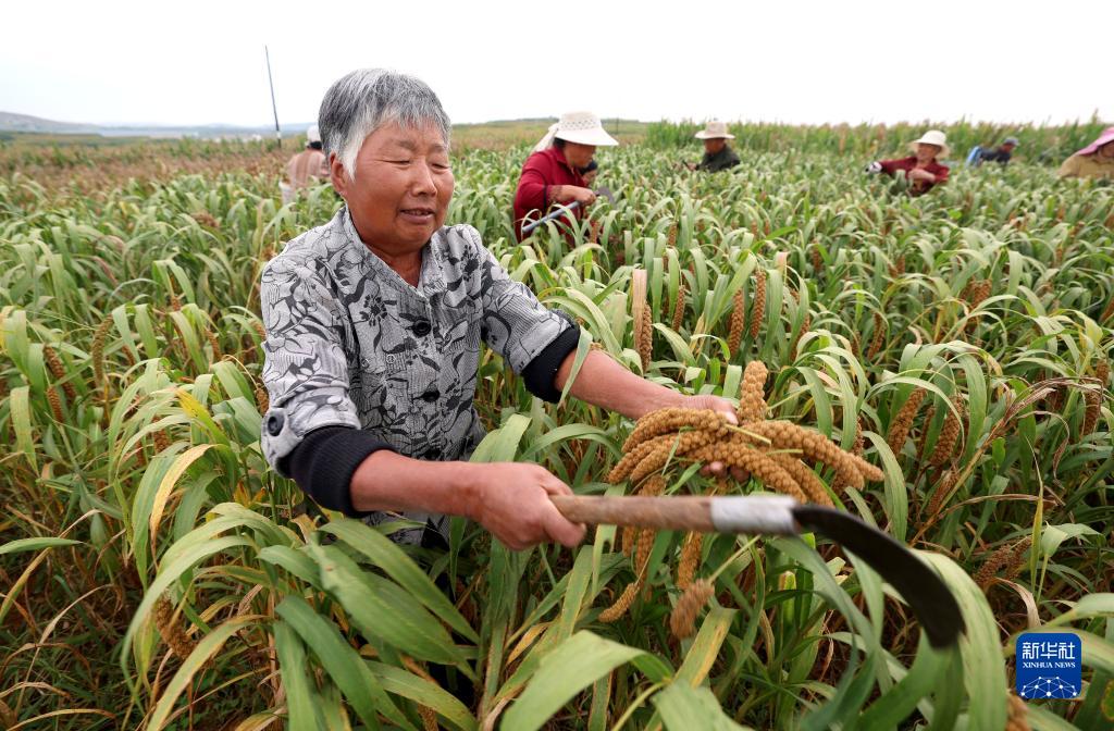 9月23日,農戶在河北省石家莊市行唐縣北河鄉(xiāng)朱家莊村谷子種植基地收獲谷子。