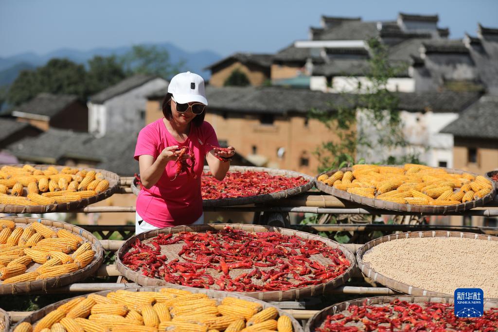 金秋時節,在安徽省黃山市徽州區呈坎村及黃山市歙縣深渡鎮陽產村,“曬秋”成為秋天里一道靚麗的風景。“曬秋”是皖南地區的傳統習俗,由于氣候潮濕,當地村民利用晴好天氣,將收獲的農作物集中晾曬。五顏六色的農作物被拼成精美的圖案,慶祝豐收的同時,也成為當地特色景觀,吸引不少游客前來觀賞。