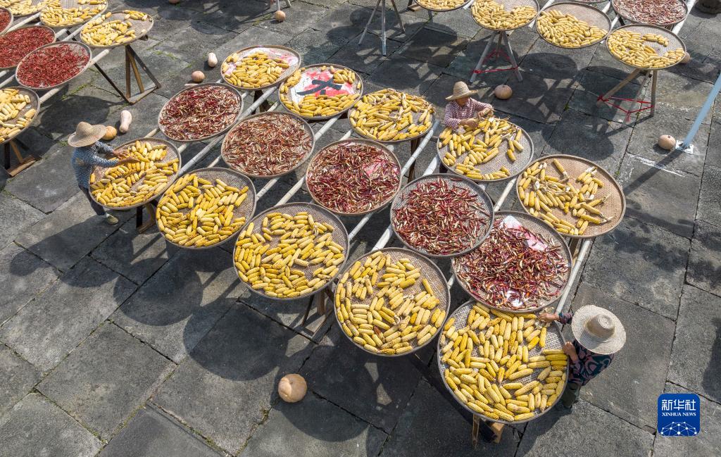 金秋時節,在安徽省黃山市徽州區呈坎村及黃山市歙縣深渡鎮陽產村,“曬秋”成為秋天里一道靚麗的風景?!皶袂铩笔峭钅系貐^的傳統習俗,由于氣候潮濕,當地村民利用晴好天氣,將收獲的農作物集中晾曬。五顏六色的農作物被拼成精美的圖案,慶祝豐收的同時,也成為當地特色景觀,吸引不少游客前來觀賞。