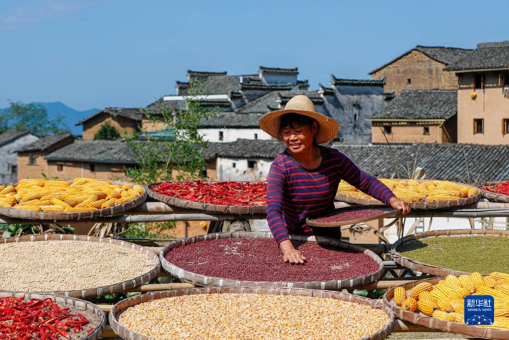 9月18日,在黃山市歙縣陽產(chǎn)村,村民在曬場(chǎng)上晾曬農(nóng)作物。