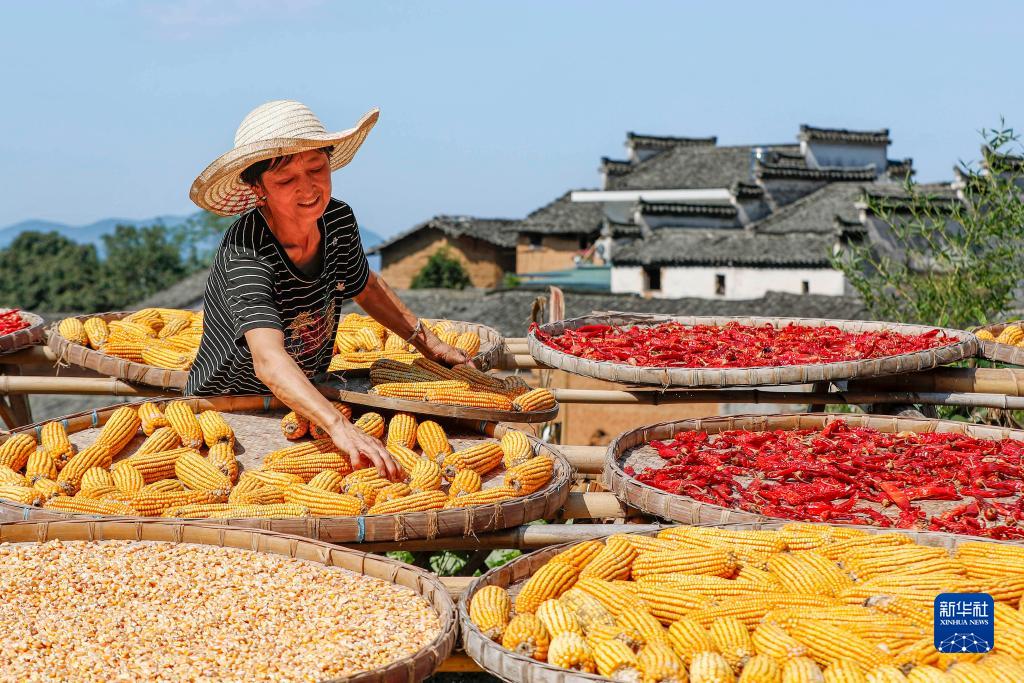 9月18日,在黃山市歙縣陽產村,村民在曬場上晾曬農作物。