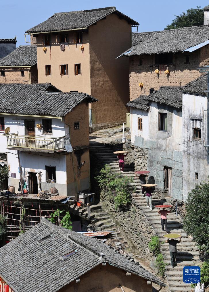 9月18日,在黃山市歙縣陽產村,村民頭頂曬匾走在村里,準備晾曬農作物。