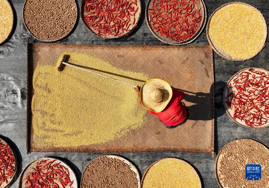 金秋時(shí)節(jié),在安徽省黃山市徽州區(qū)呈坎村及黃山市歙縣深渡鎮(zhèn)陽產(chǎn)村,“曬秋”成為秋天里一道靚麗的風(fēng)景。“曬秋”是皖南地區(qū)的傳統(tǒng)習(xí)俗,由于氣候潮濕,當(dāng)?shù)卮迕窭们绾锰鞖猓瑢⑹斋@的農(nóng)作物集中晾曬。五顏六色的農(nóng)作物被拼成精美的圖案,慶祝豐收的同時(shí),也成為當(dāng)?shù)靥厣坝^,吸引不少游客前來觀賞。