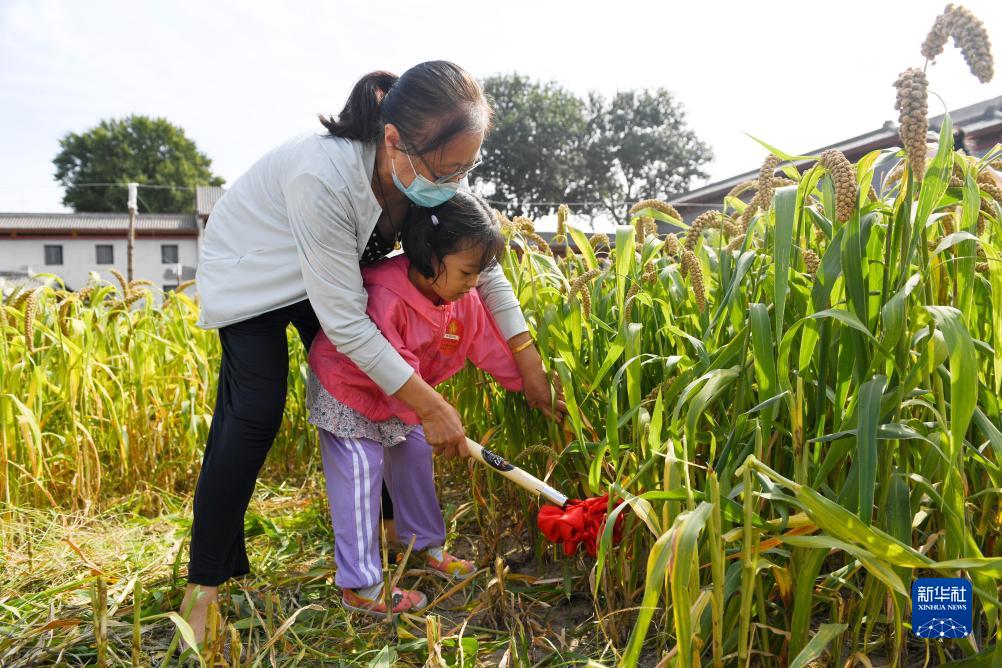 9月23日,一位家長帶著小朋友在北京先農壇耤田內體驗收割稷。