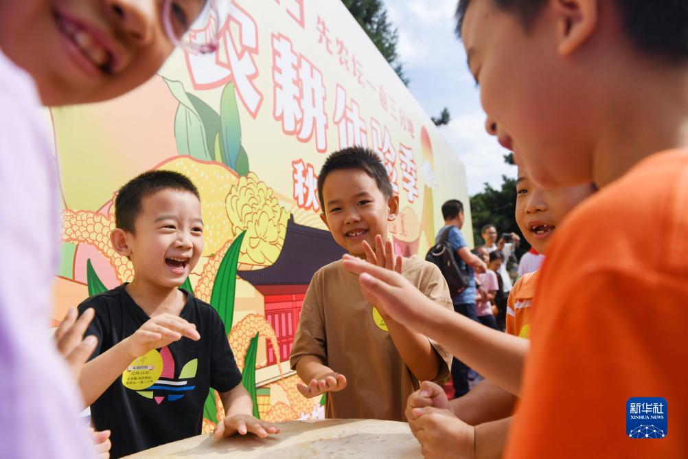 9月23日,小朋友在農(nóng)耕體驗(yàn)季活動(dòng)上敲響“豐收鼓”。