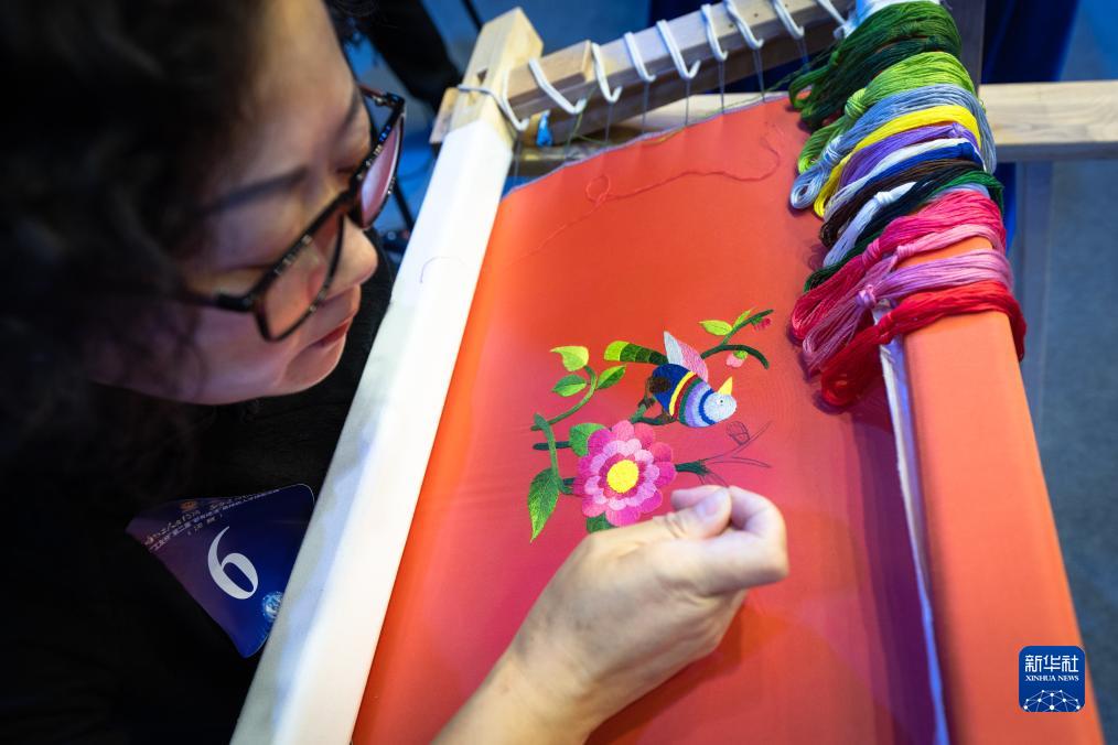 9月21日,選手陳紅平在現場展示利川刺繡技藝。