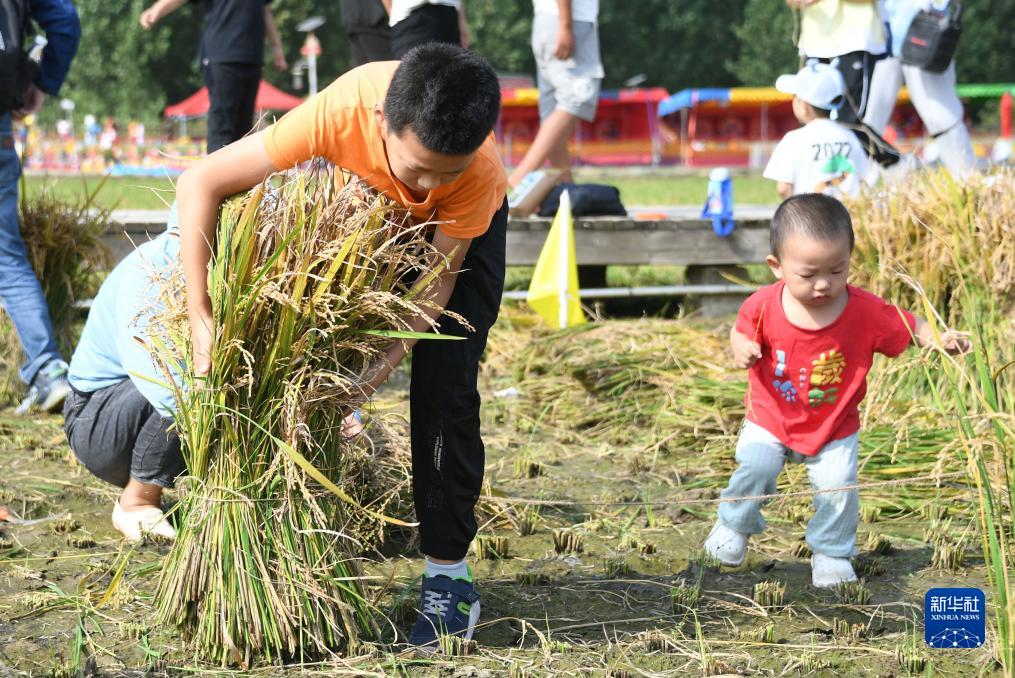 9月23日,在北京市海淀區(qū)上莊鎮(zhèn)西馬坊京西稻田,小朋友在活動(dòng)中參加割稻子比賽。