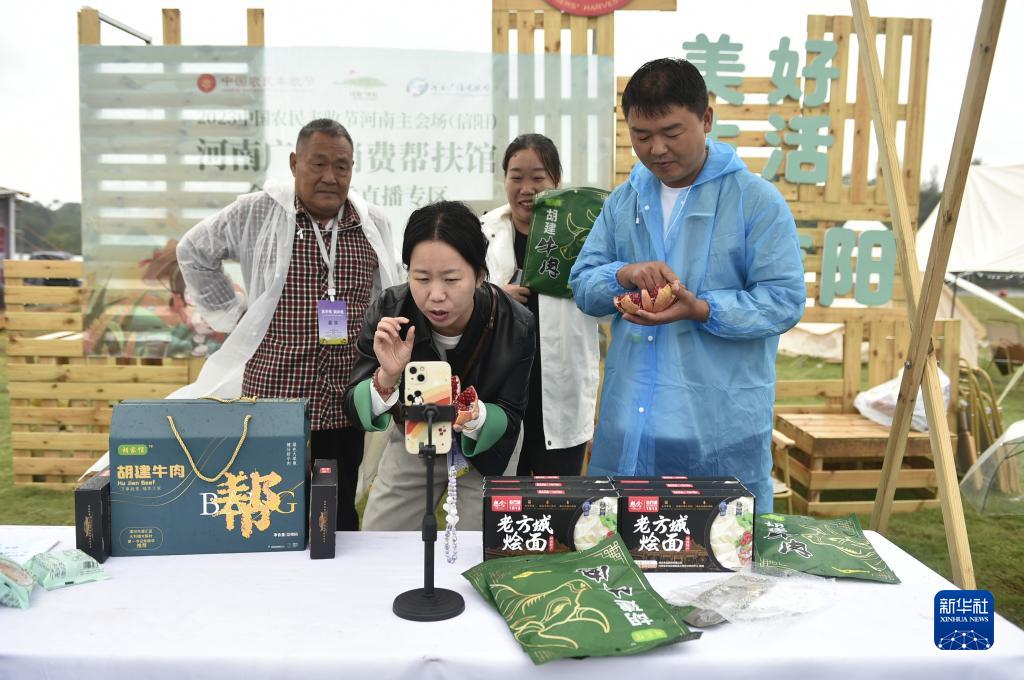 9月23日,工作人員在活動現場通過網絡直播推介特色農產品。