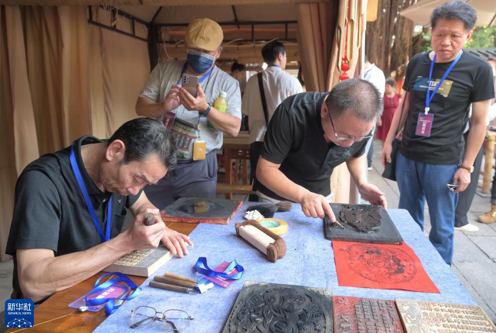 9月23日,福建省南平市建陽建本匠人黃行忠(左一)在活動現場展示建本雕版。