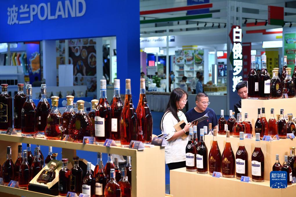 9月22日,觀眾在一家進口酒經銷商的展柜前參觀。