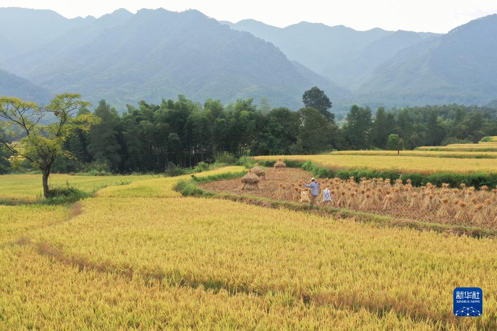 9月12日,在安徽省宣城市旌德縣白地鎮(zhèn),農(nóng)民將收獲的水稻運回家中(無人機照片)。