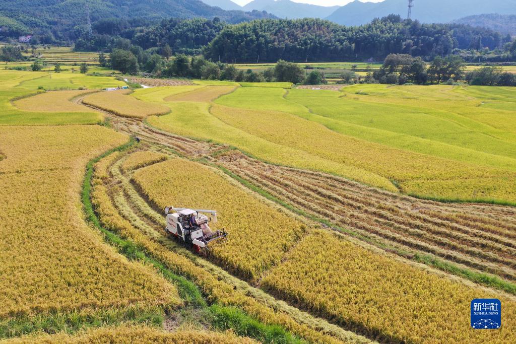9月11日,在安徽省宣城市旌德縣白地鎮,農民駕駛收割機收割水稻(無人機照片)。