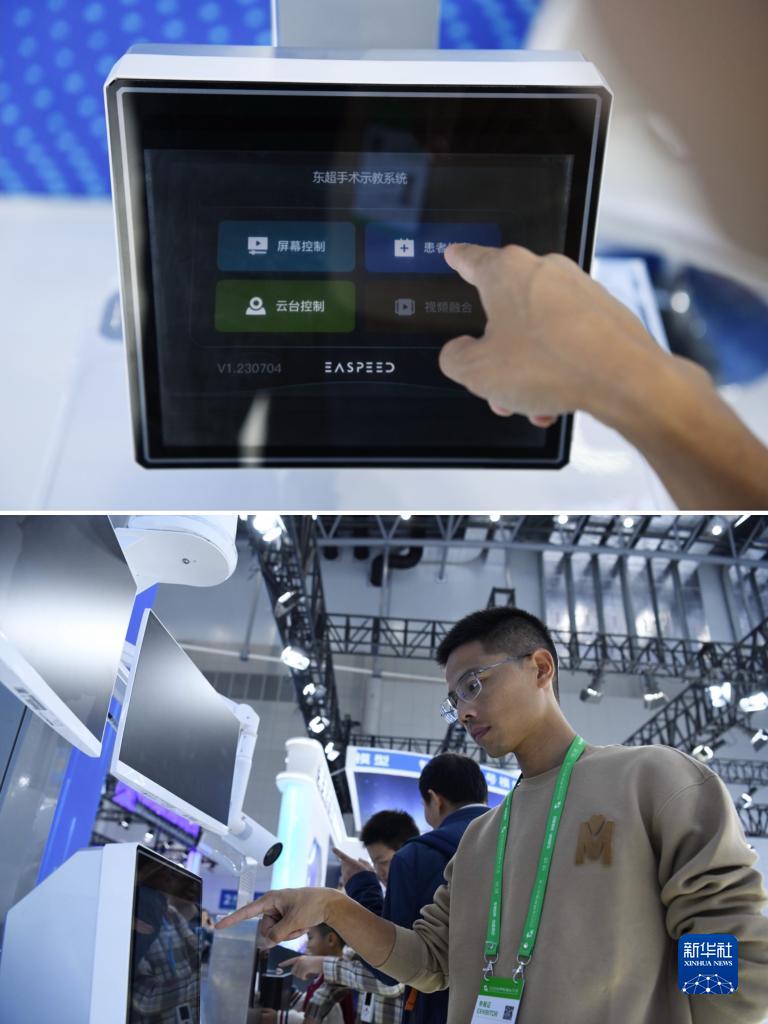 拼版照片:在2023世界制造業(yè)大會上,工作人員在演示一款基于“可交互空中成像”技術(shù)的非接觸式智慧醫(yī)療系統(tǒng),工作人員無需接觸屏幕,便可直接于空中完成操控(9月23日攝)。