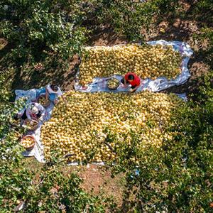 9月20日,安徽省宿州市碭山縣園藝場工人在分揀剛采摘的碭山酥梨(無人機照片)。