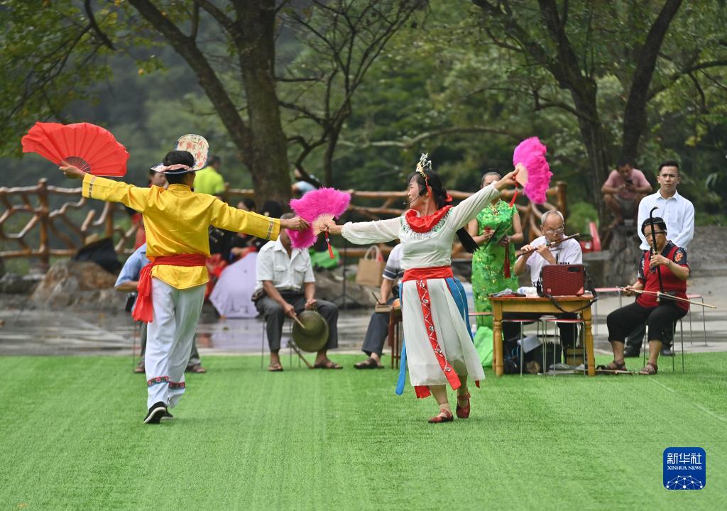 9月23日,在柳州市融安縣東起鄉崖腳村銅板屯,新建的民族文化同心廣場吸引周邊群眾前來表演節目。