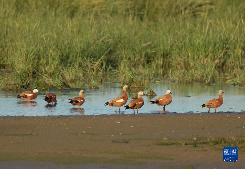 9月23日,一群赤麻鴨在河北省秦皇島市北戴河區(qū)沿海濕地覓食。