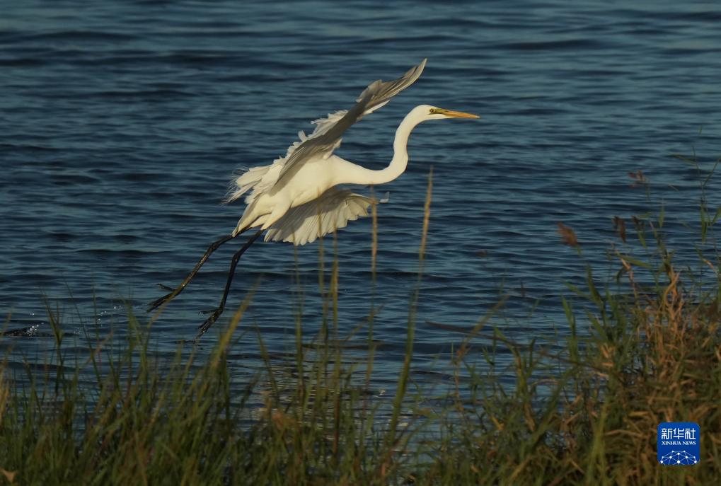 9月23日,一只白鷺在河北省秦皇島市北戴河區沿海濕地飛舞。