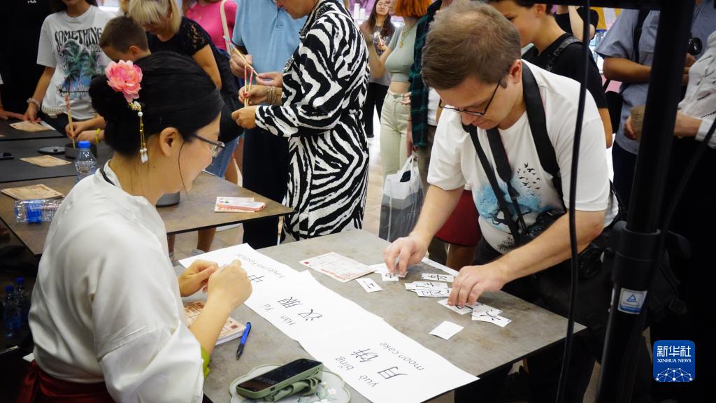 9月23日,在塞爾維亞諾維薩德舉行的“漢服節”活動上,一名市民體驗拼讀漢字游戲。