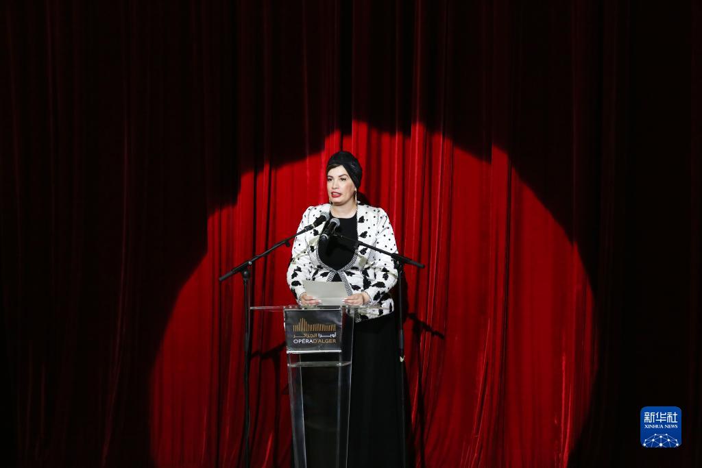 9月22日,在阿爾及利亞阿爾及爾,阿爾及利亞文化和藝術部長蘇拉婭·穆盧吉在蘇州芭蕾舞團演出前致辭。