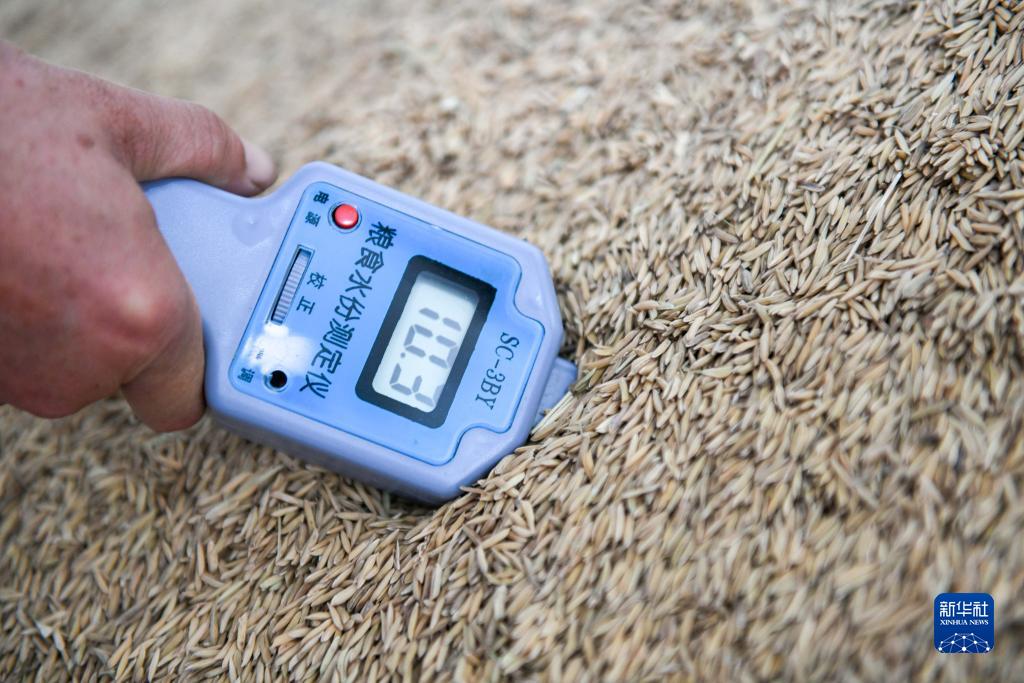 9月24日,在湖南省永州市道縣梅花鎮一家糧食收購企業,工作人員在測定稻谷水份。